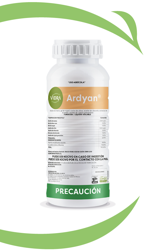 In its differentiated composition, Ardyan® contains aloe vera (Aloe vera) and pineapple (Ananas comosus) extracts. These two extracts make Ardyan® a solution with a fungicidal effect with different mechanisms of action due to the synergy of organic compounds such as anthraquinones. Among these compounds is the aloin contained in the aloe extract, which complements its effect with the bromelain present in the pineapple extract, both of which act directly by inhibiting the germination of spores and the growth of phytopathogenic fungi.