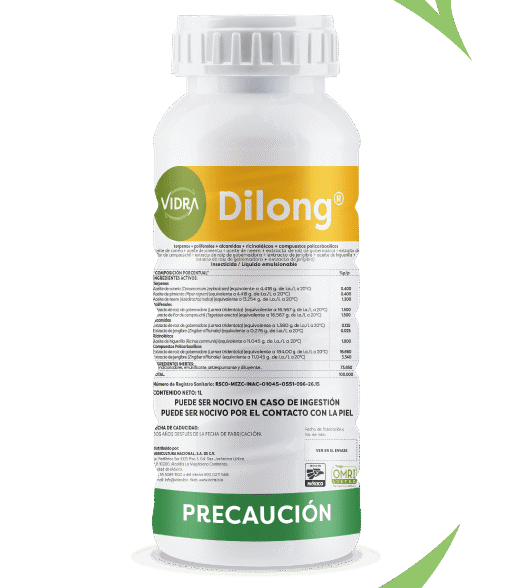 Los metabolitos de Dilong® potencializados con PYB TECH® actúan en diferentes sitios metabólicos del insecto, freciendo una acción de contacto, repelencia e ingestión. Dilong® interfiere en el proceso de muda, interrumpe el proceso de oviposición y actúa sobre el sistema nervioso del insecto.